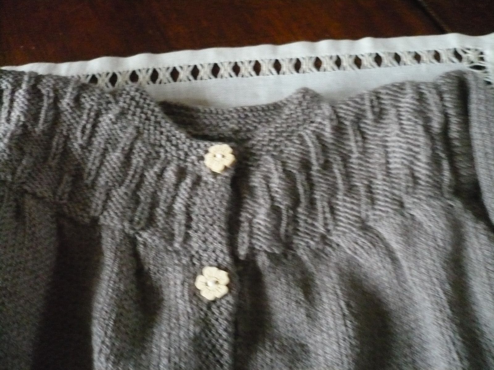 Pour les manches je suis partie de la largeur nécessaire 30cm (elles sont commencées par le haut) et j'ai calculé le nombre de mailles : 80 mailles. et au bas des manches pour former le poignet j'ai fait 5 petits plis de 2 mailles en procédant de la même manière que pour le dos et les devants espacés de 3 mailles (sauf pour un que j'ai espacé de 4 mailles pour que cela tombe juste) je suis arrivée avec 35 mailles au niveau du poignet j'ai terminé par 2cm de point mousse.
